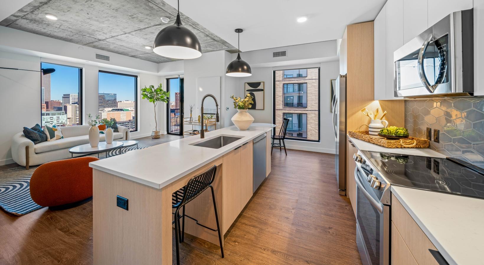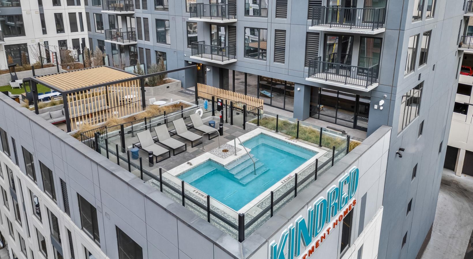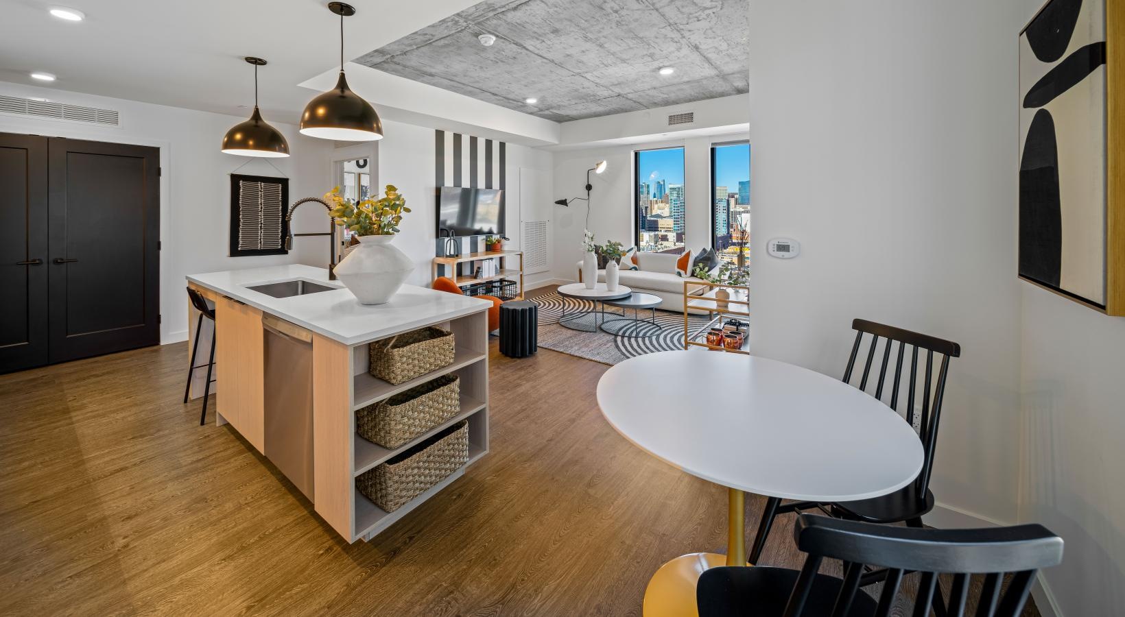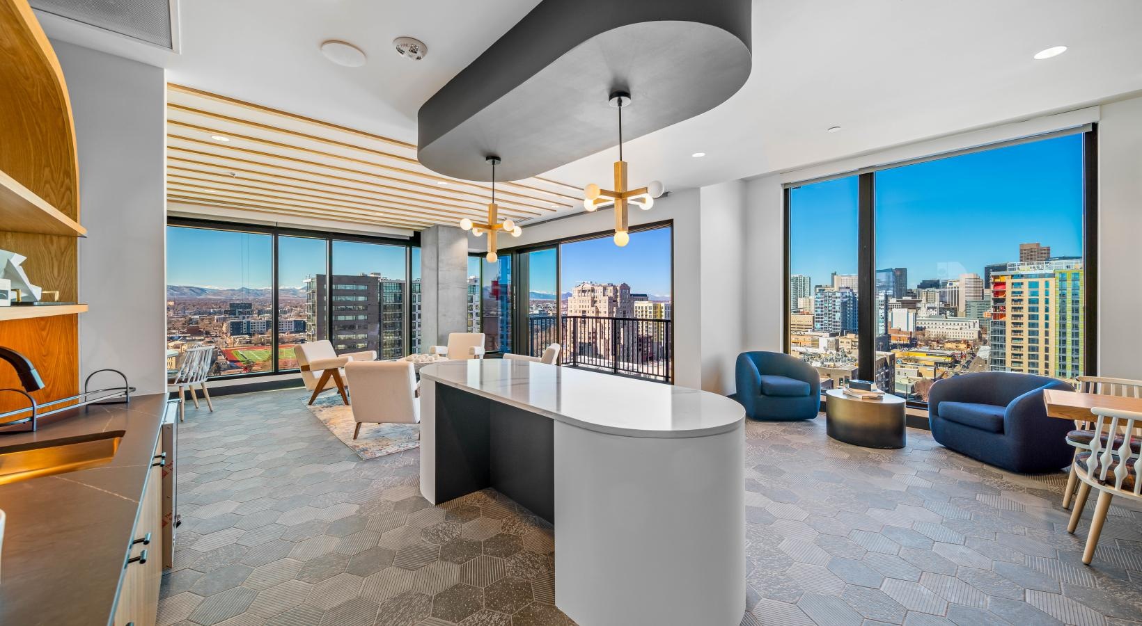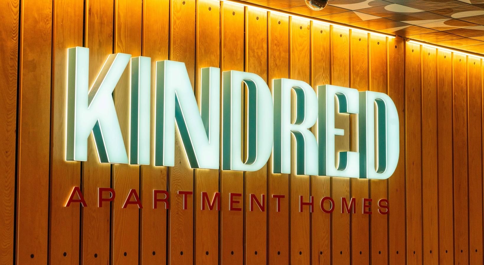 Life at Kindred is candid — neighbors chatting on the rooftop, morning coffee in the kitchen, a sunset glow across downtown.