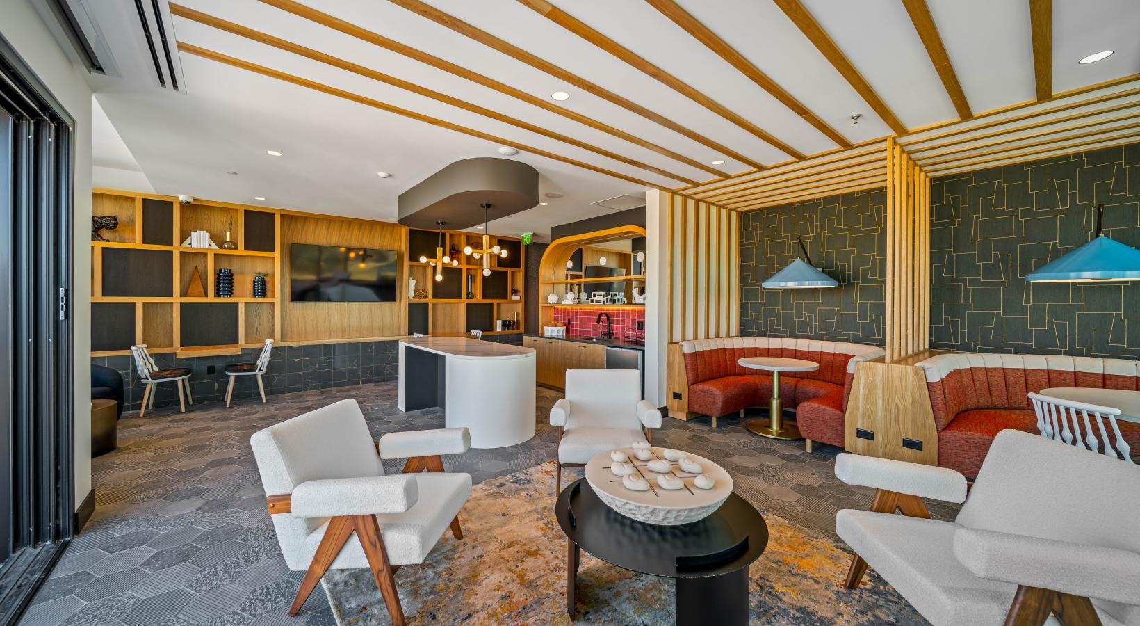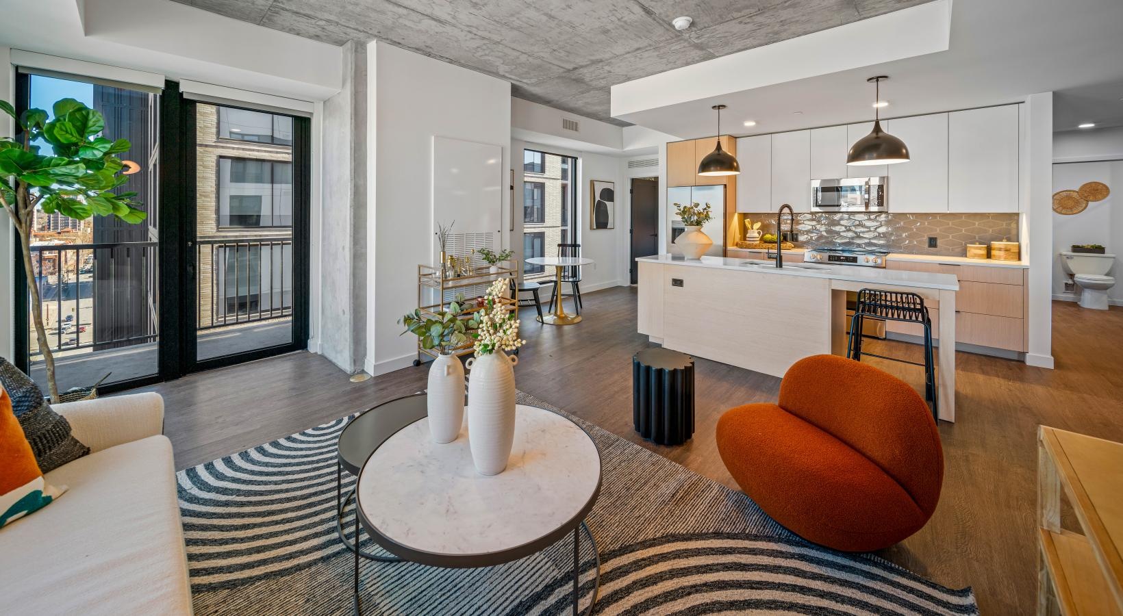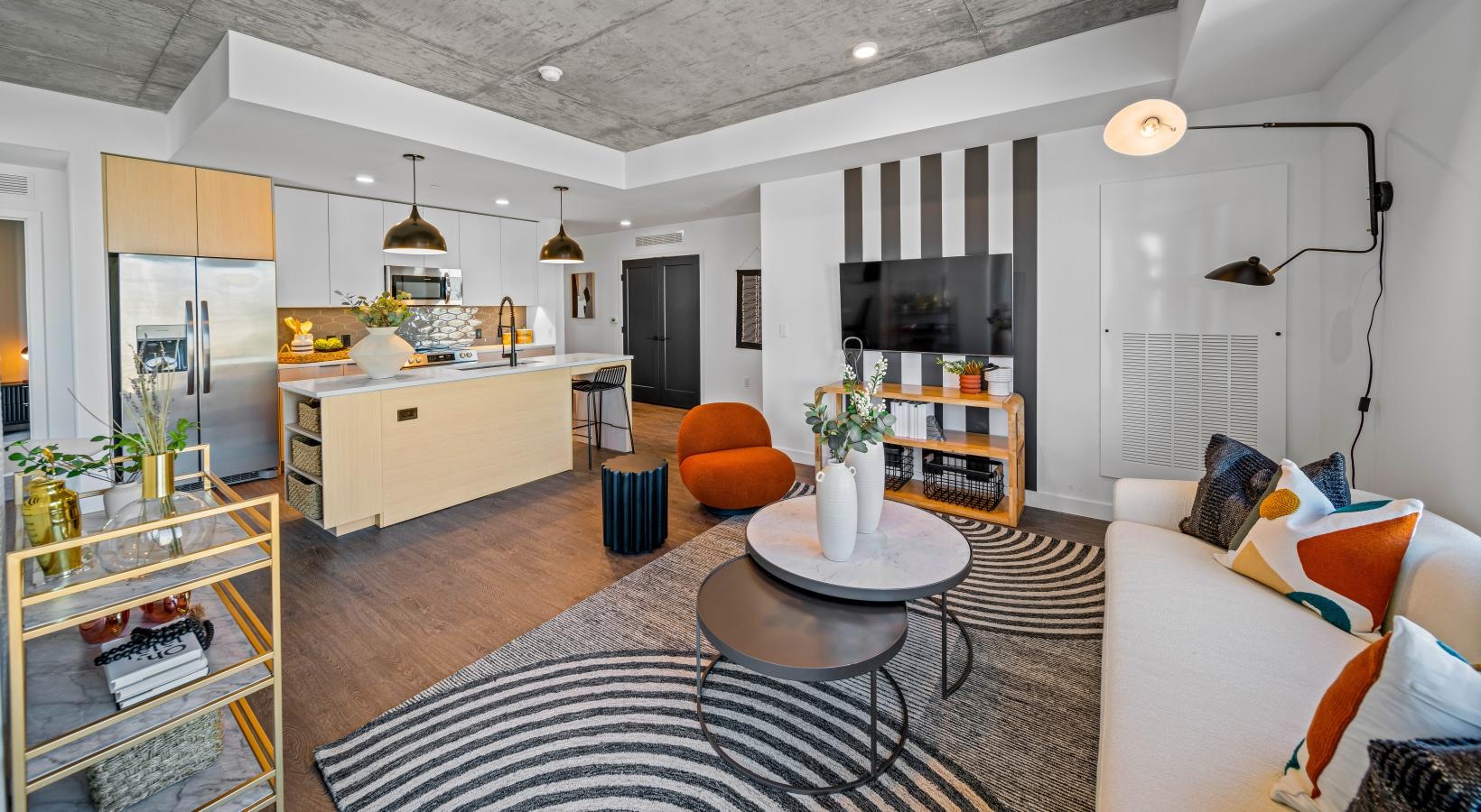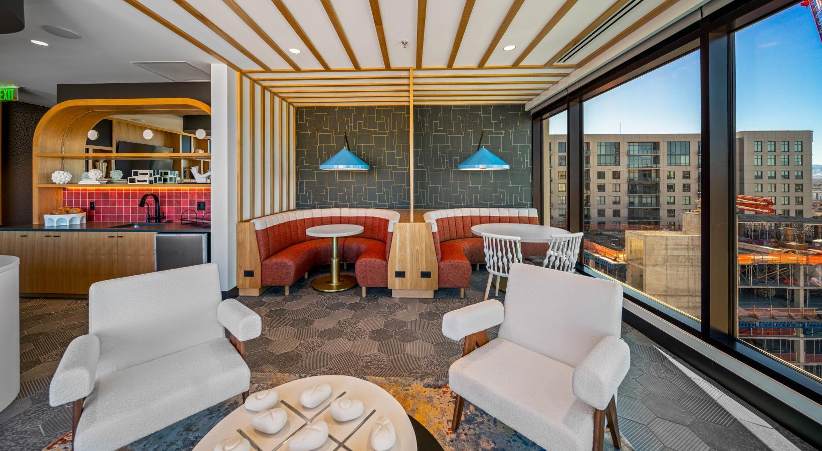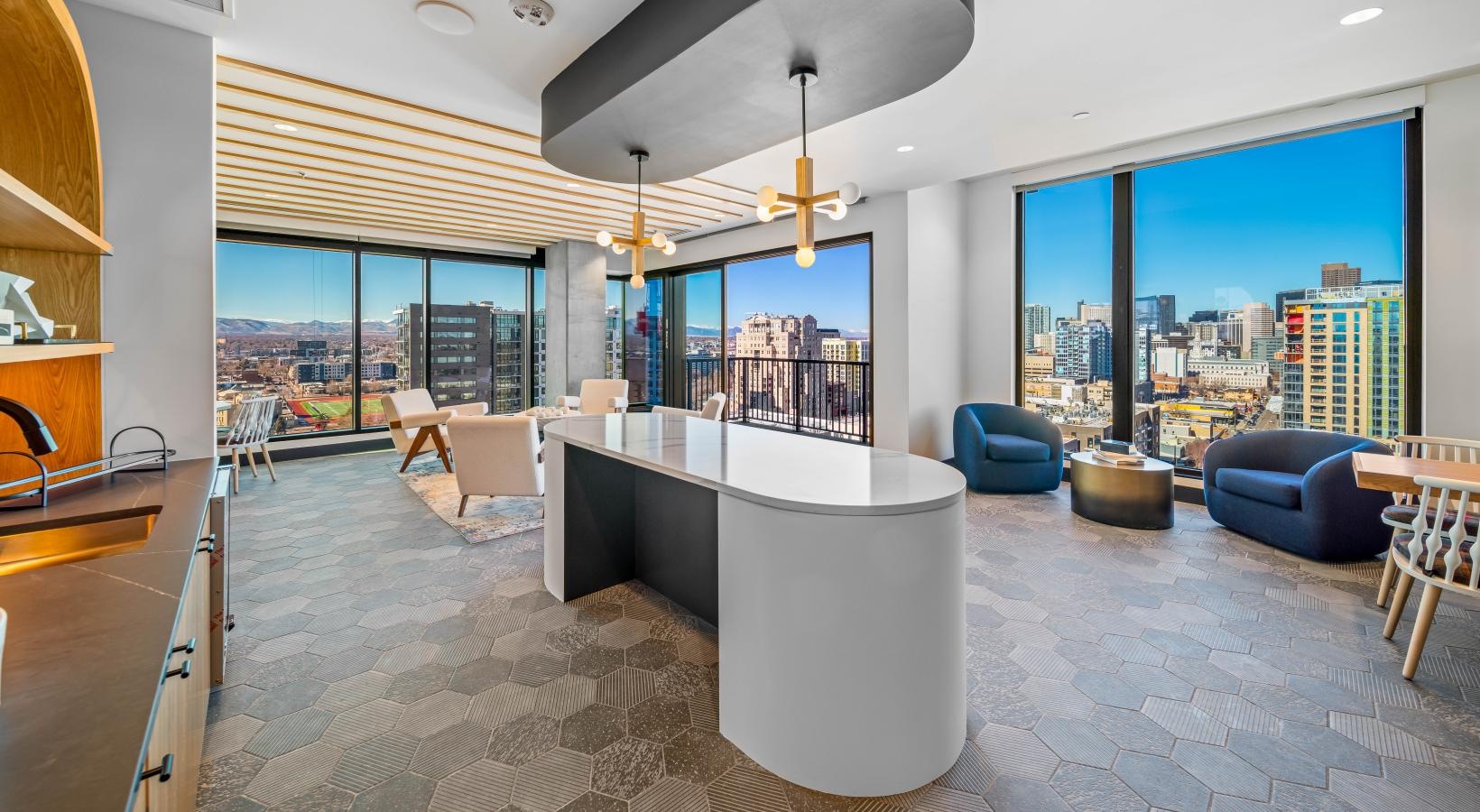 Life at Kindred is candid — neighbors chatting on the rooftop, morning coffee in the kitchen, a sunset glow across downtown.