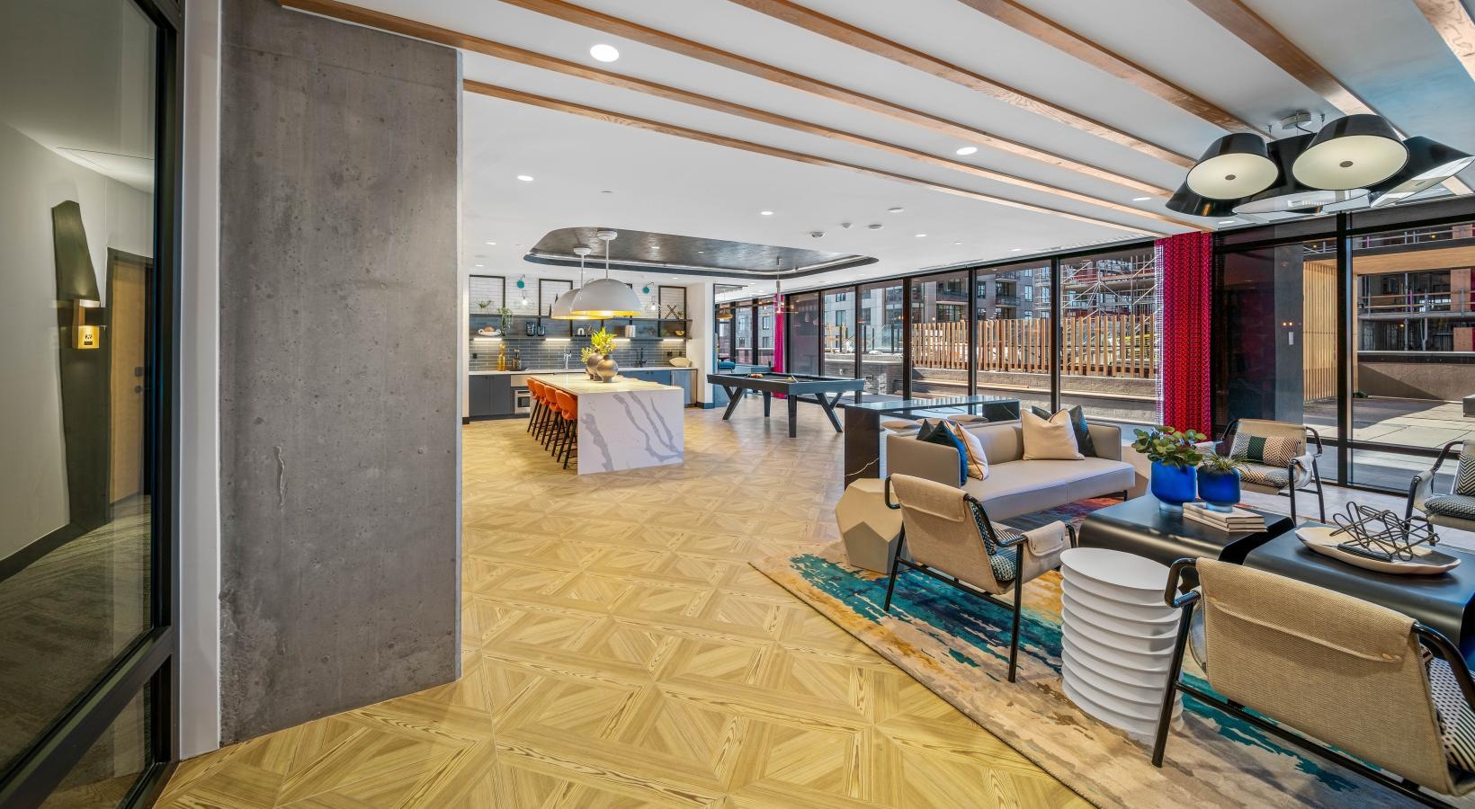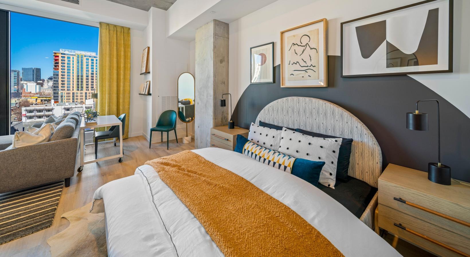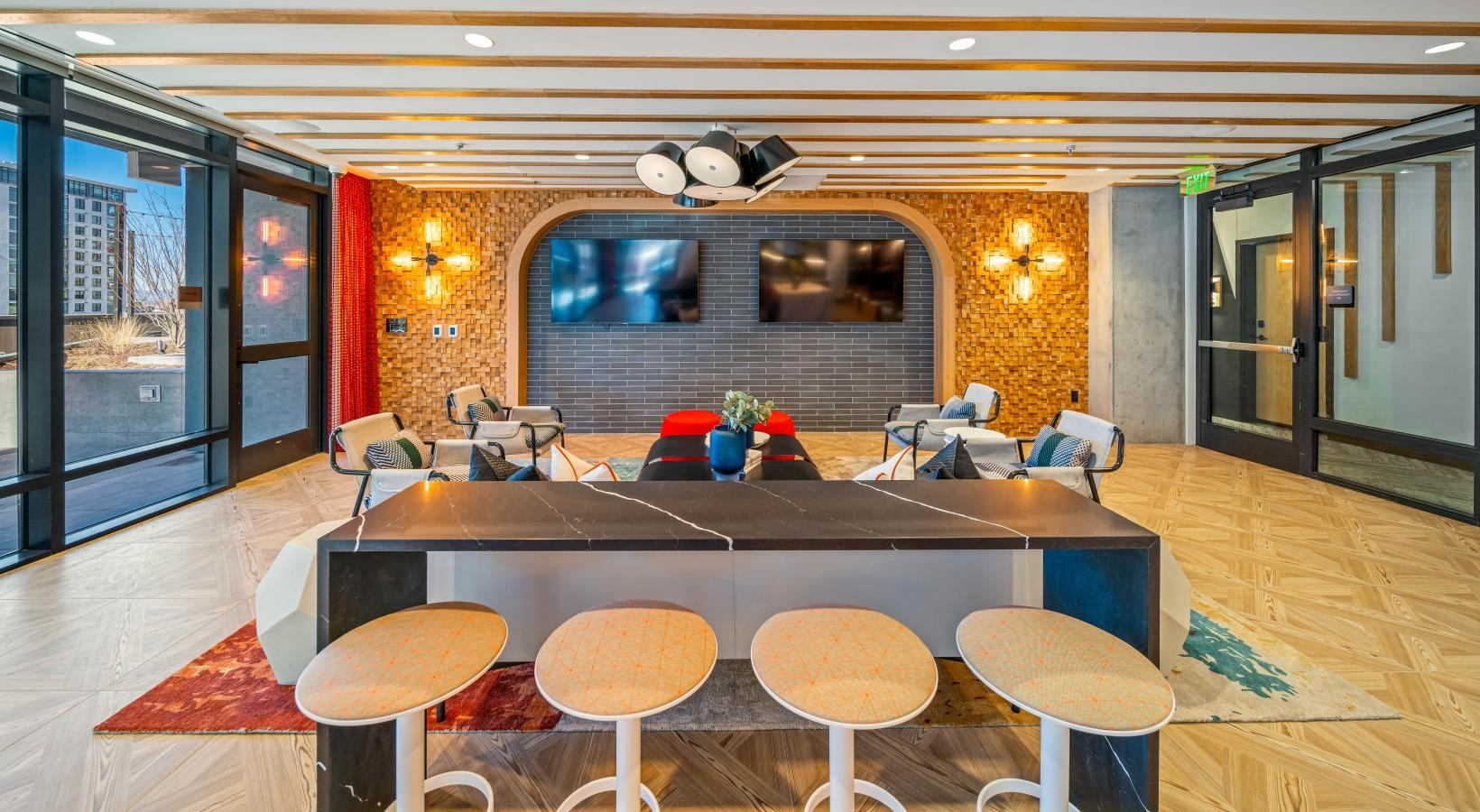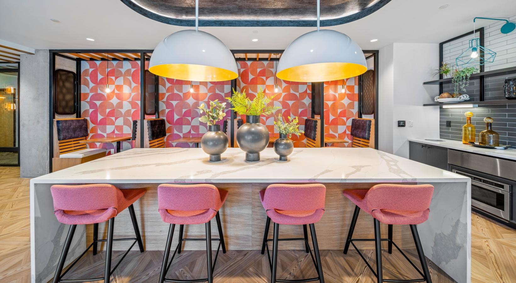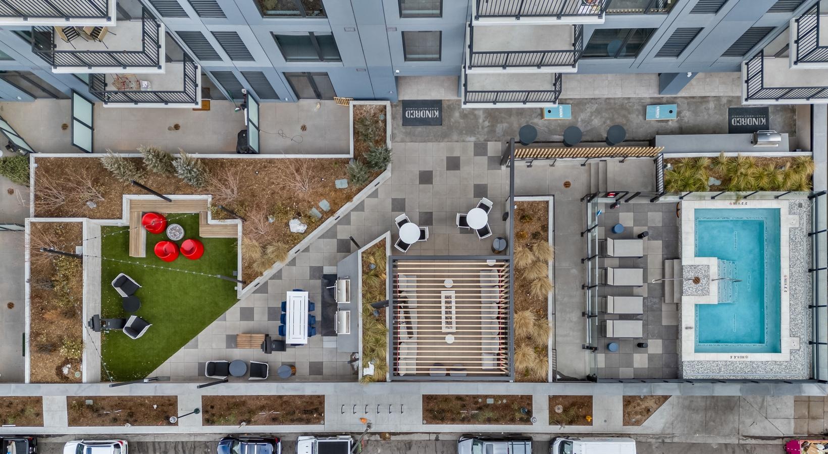 Life at Kindred is candid — neighbors chatting on the rooftop, morning coffee in the kitchen, a sunset glow across downtown.