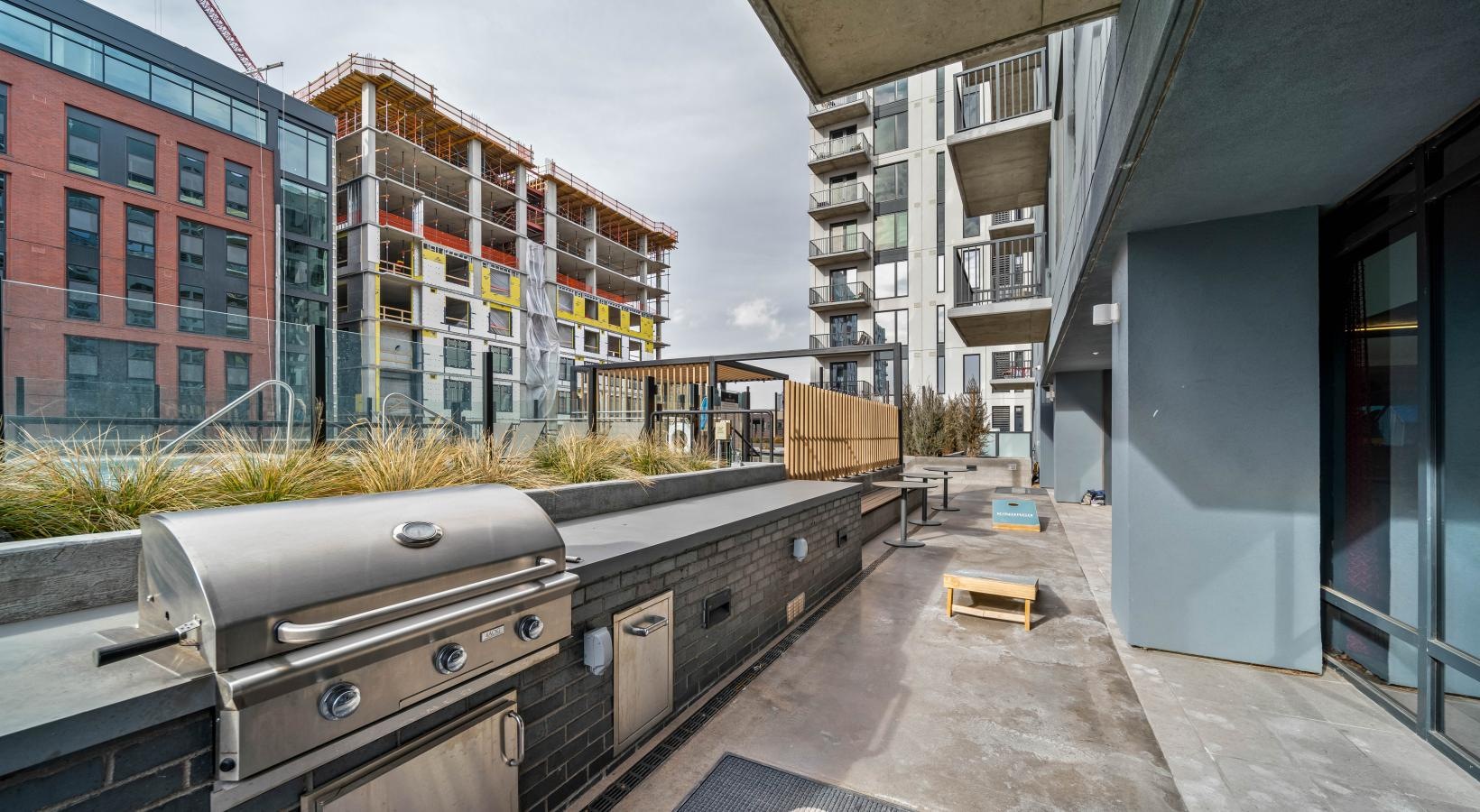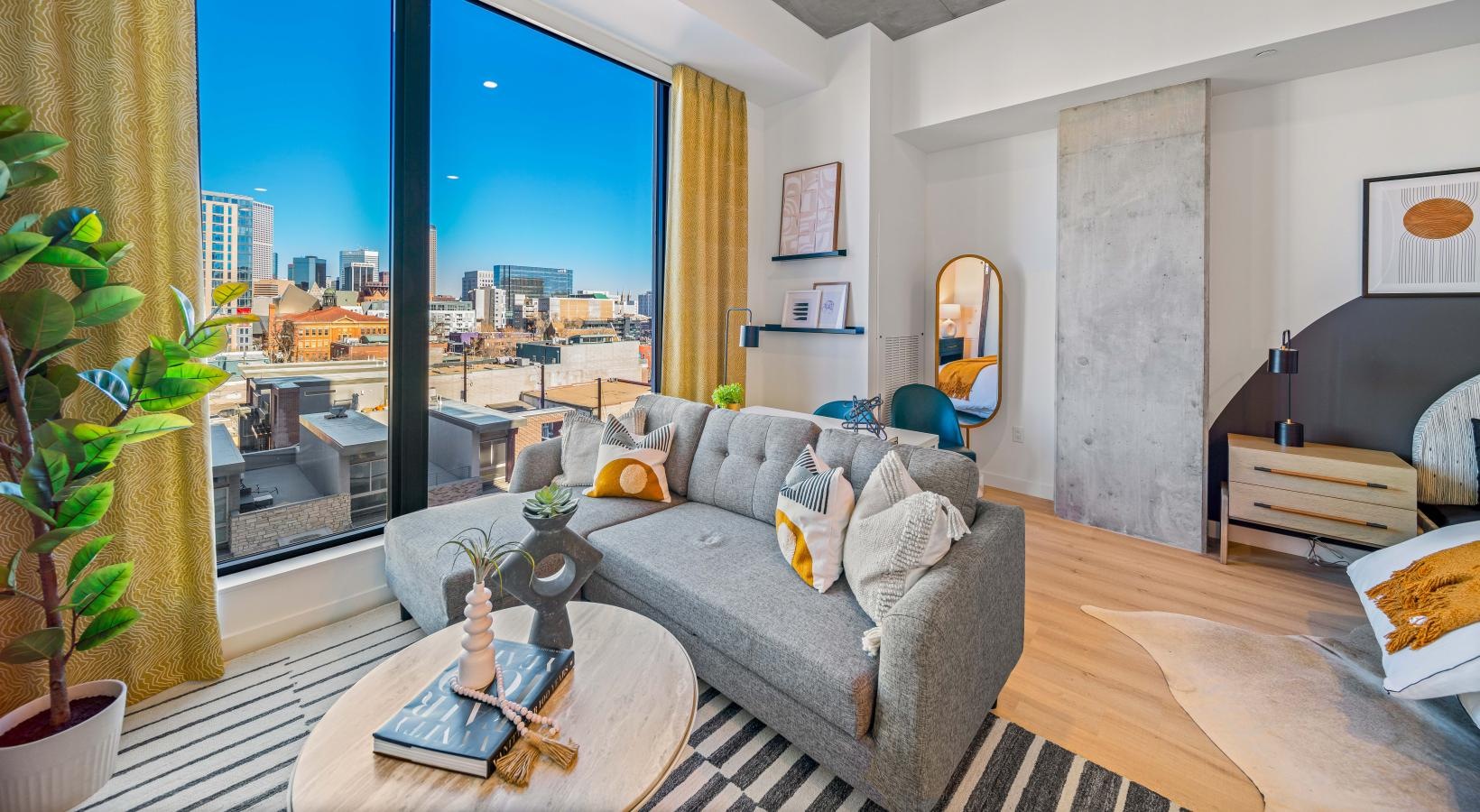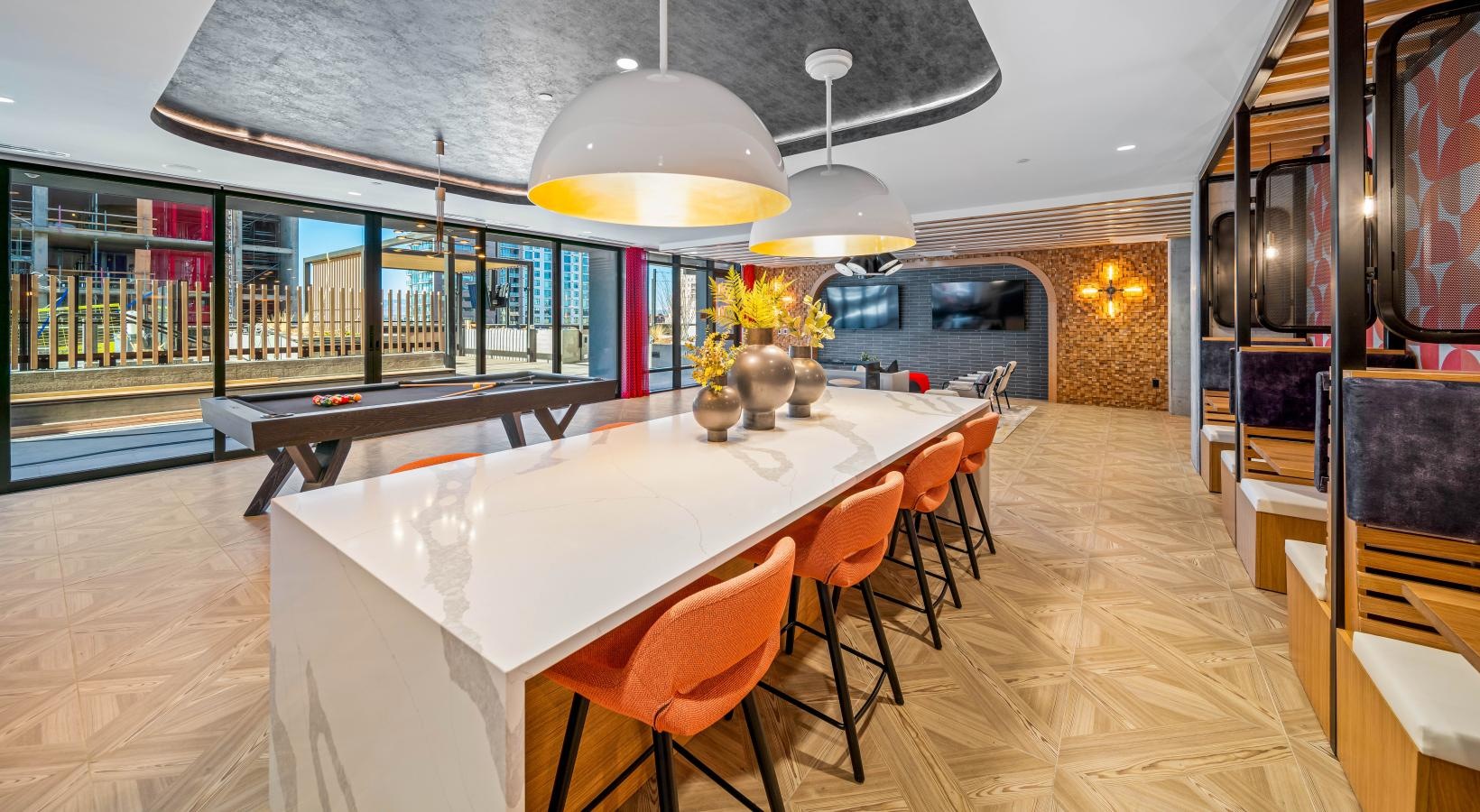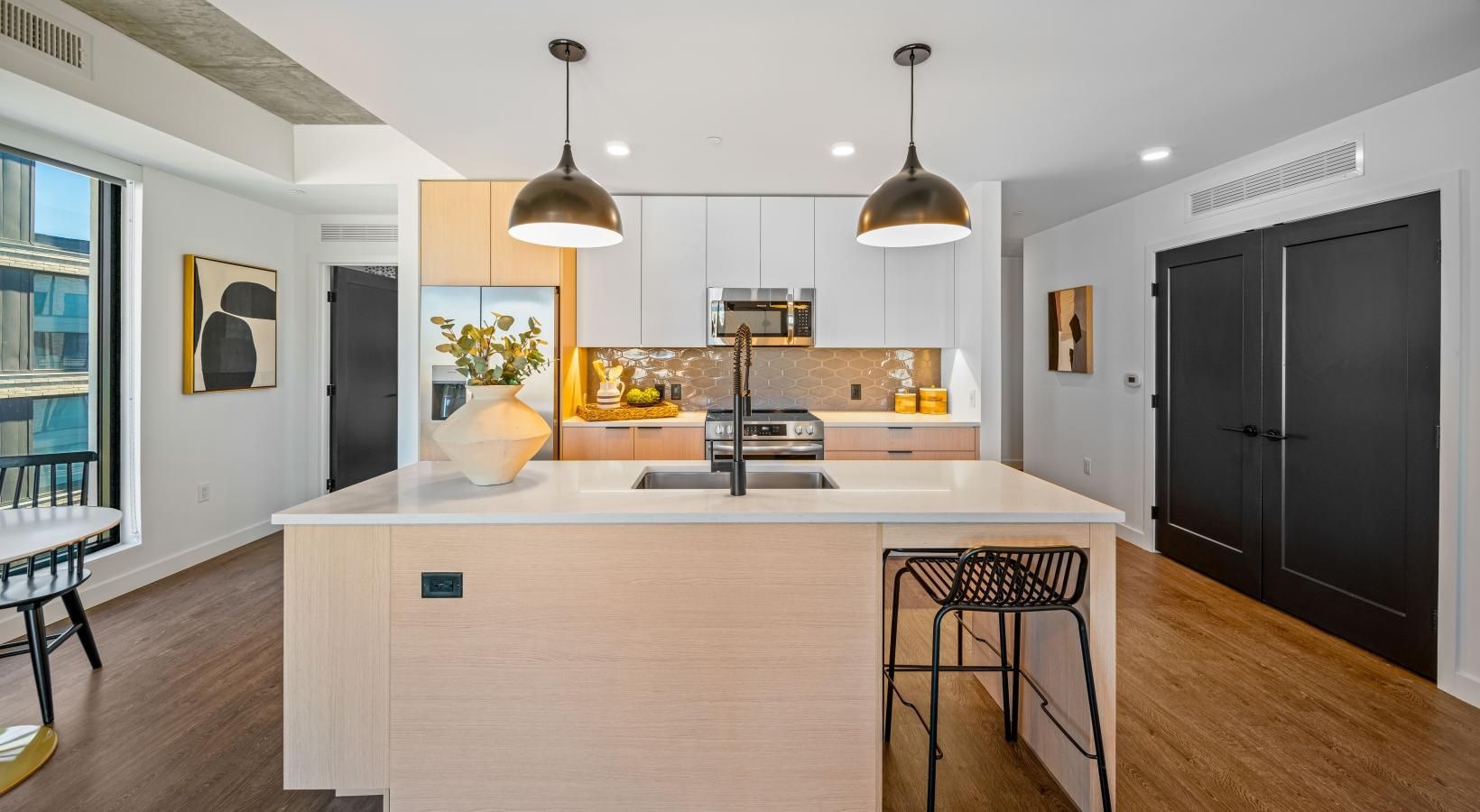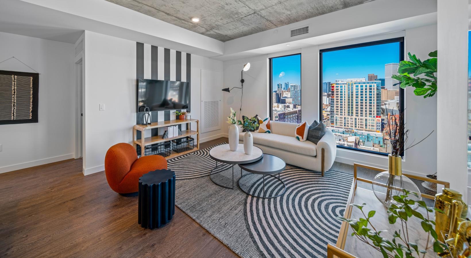 Life at Kindred is candid — neighbors chatting on the rooftop, morning coffee in the kitchen, a sunset glow across downtown.