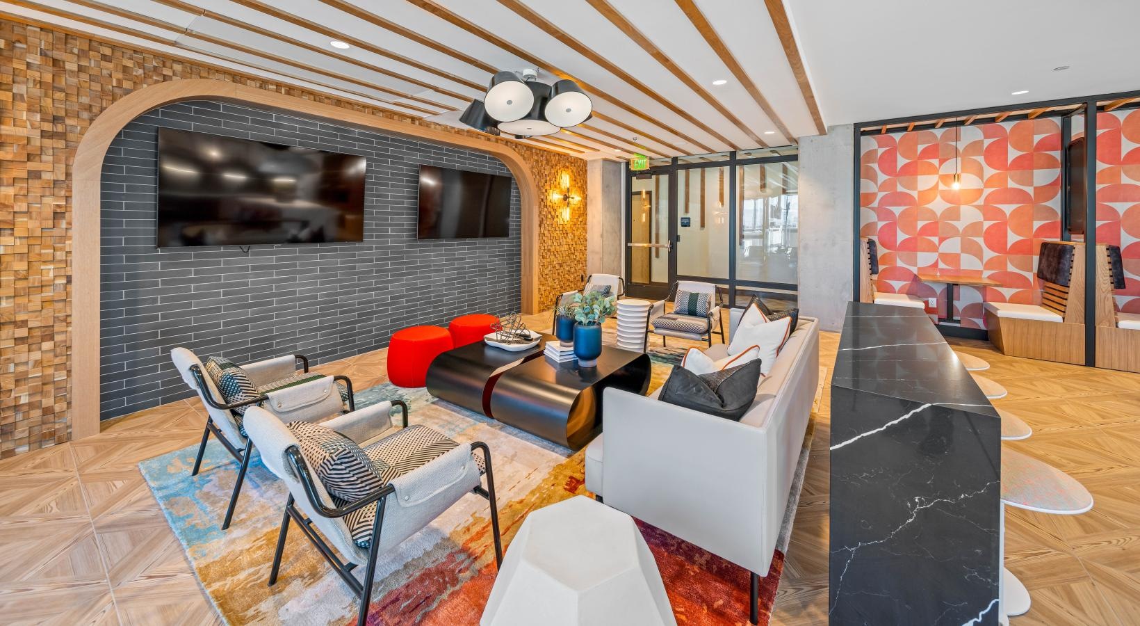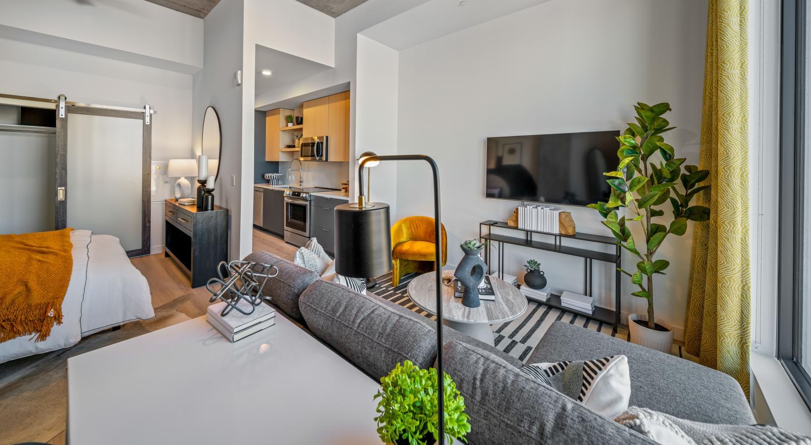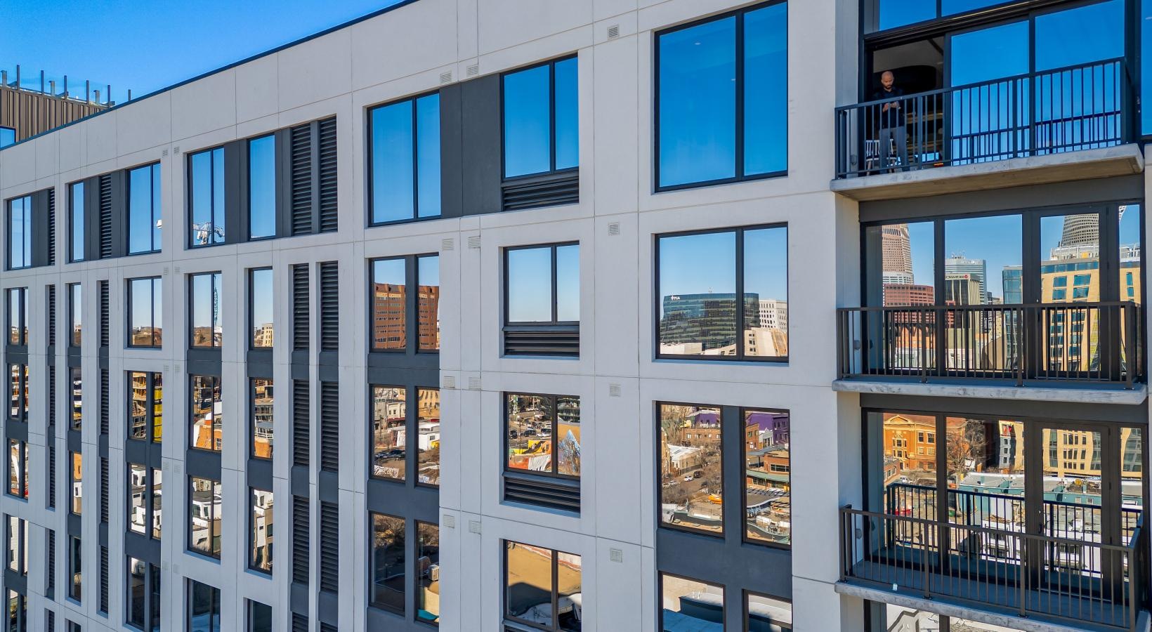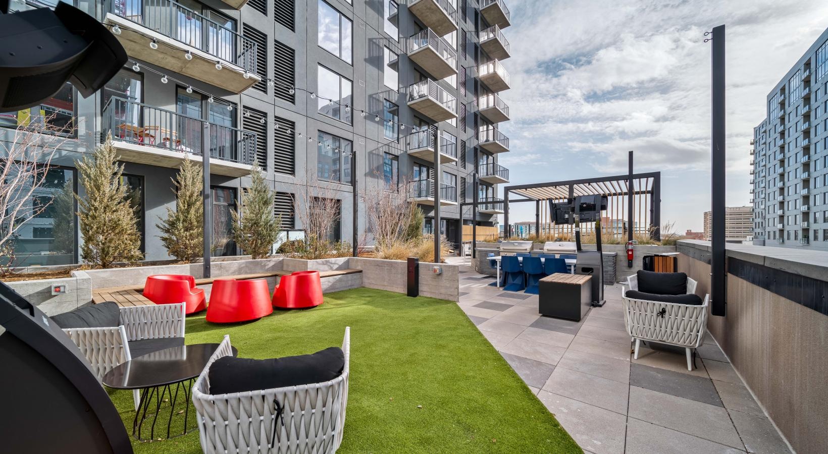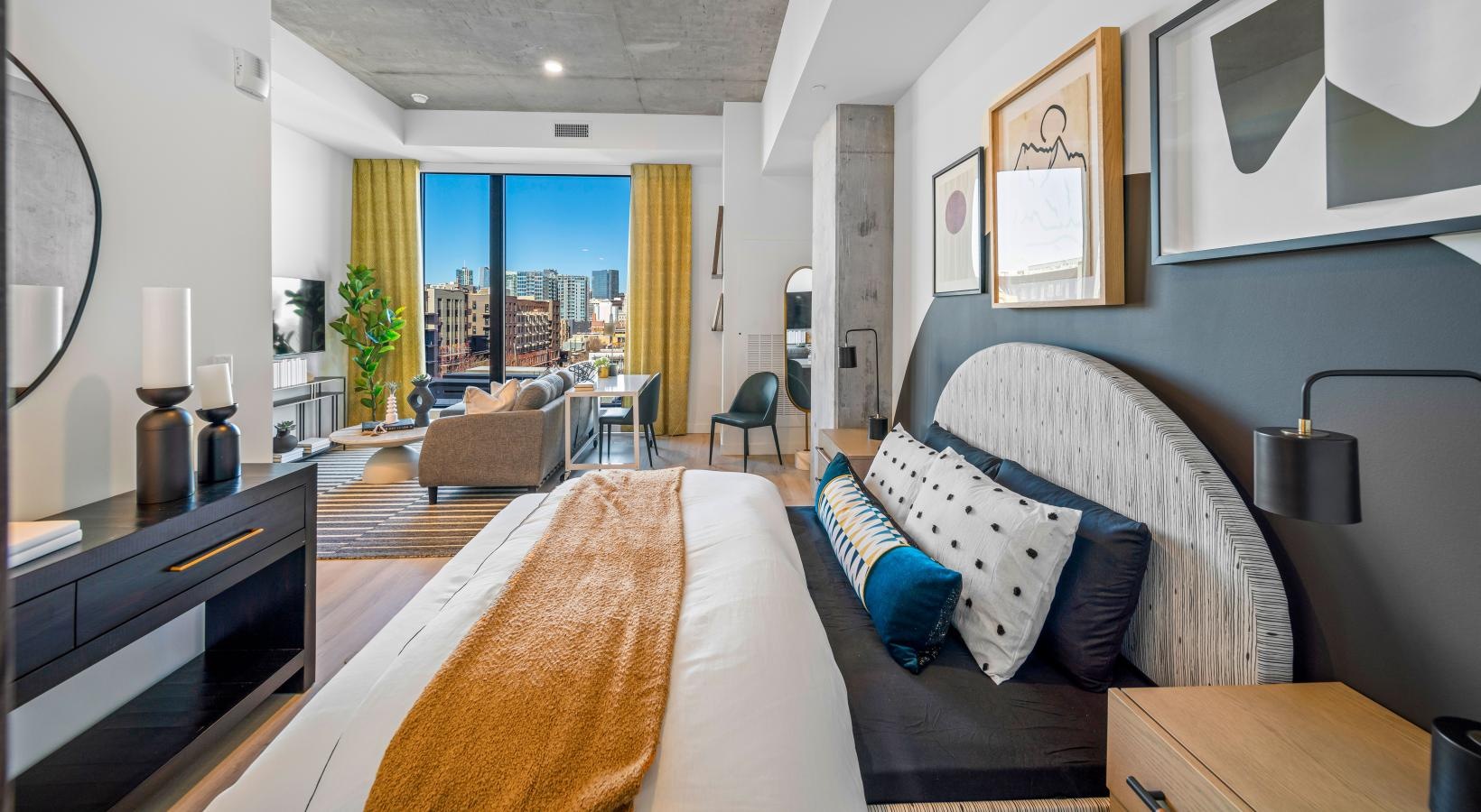 Life at Kindred is candid — neighbors chatting on the rooftop, morning coffee in the kitchen, a sunset glow across downtown.