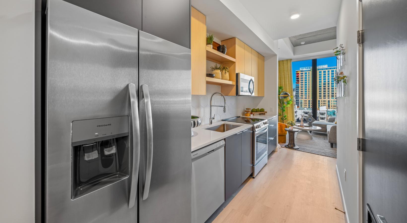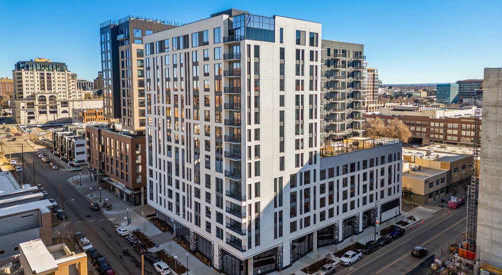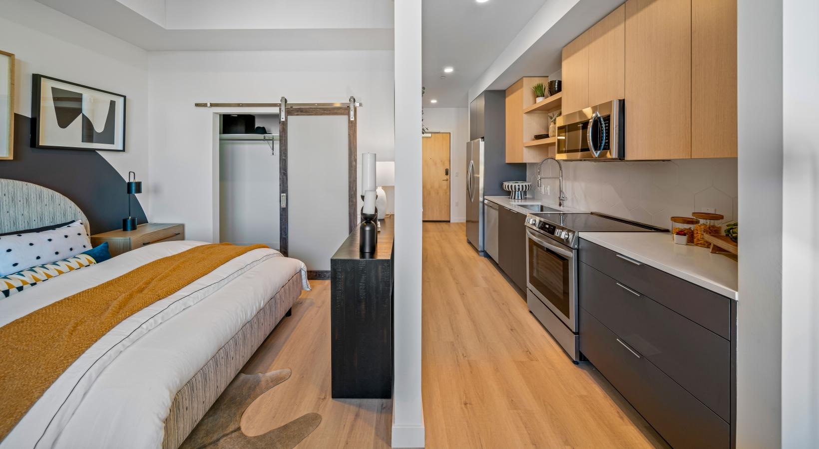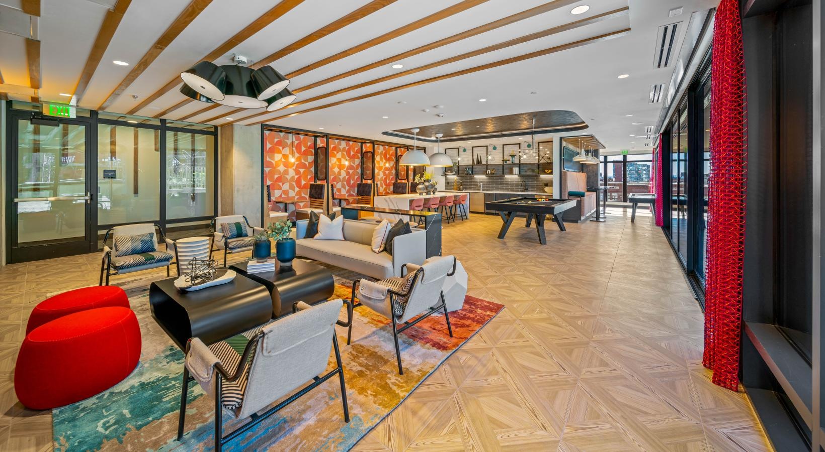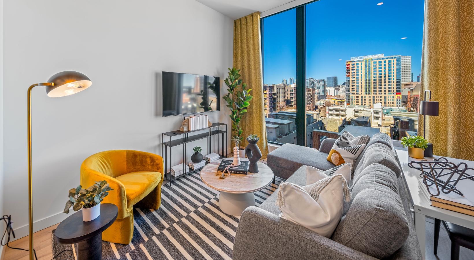 Life at Kindred is candid — neighbors chatting on the rooftop, morning coffee in the kitchen, a sunset glow across downtown.