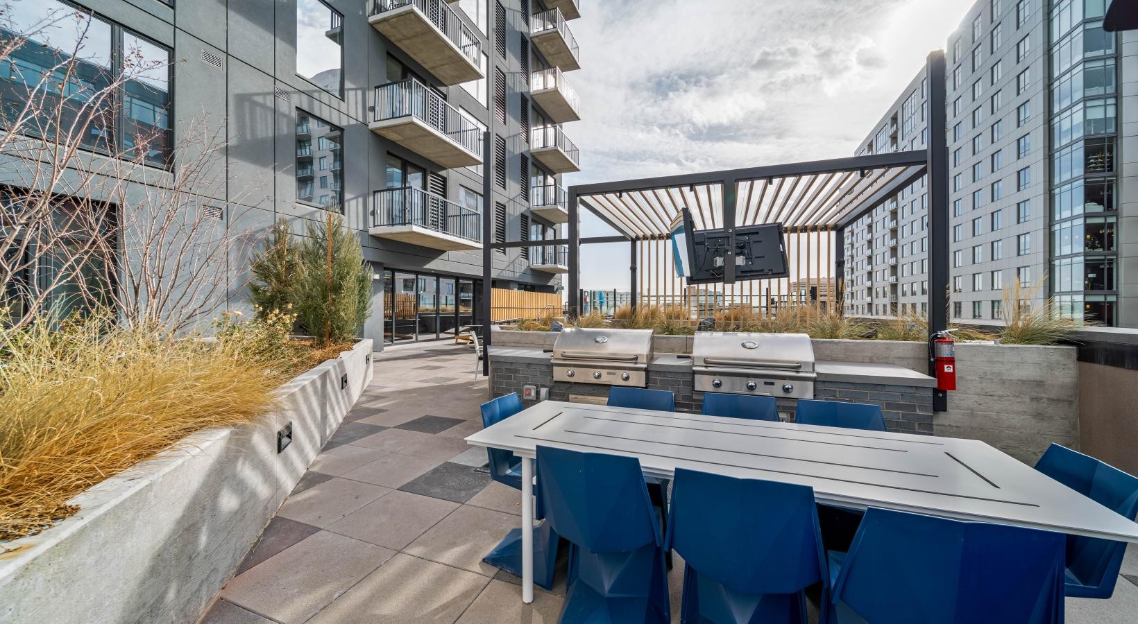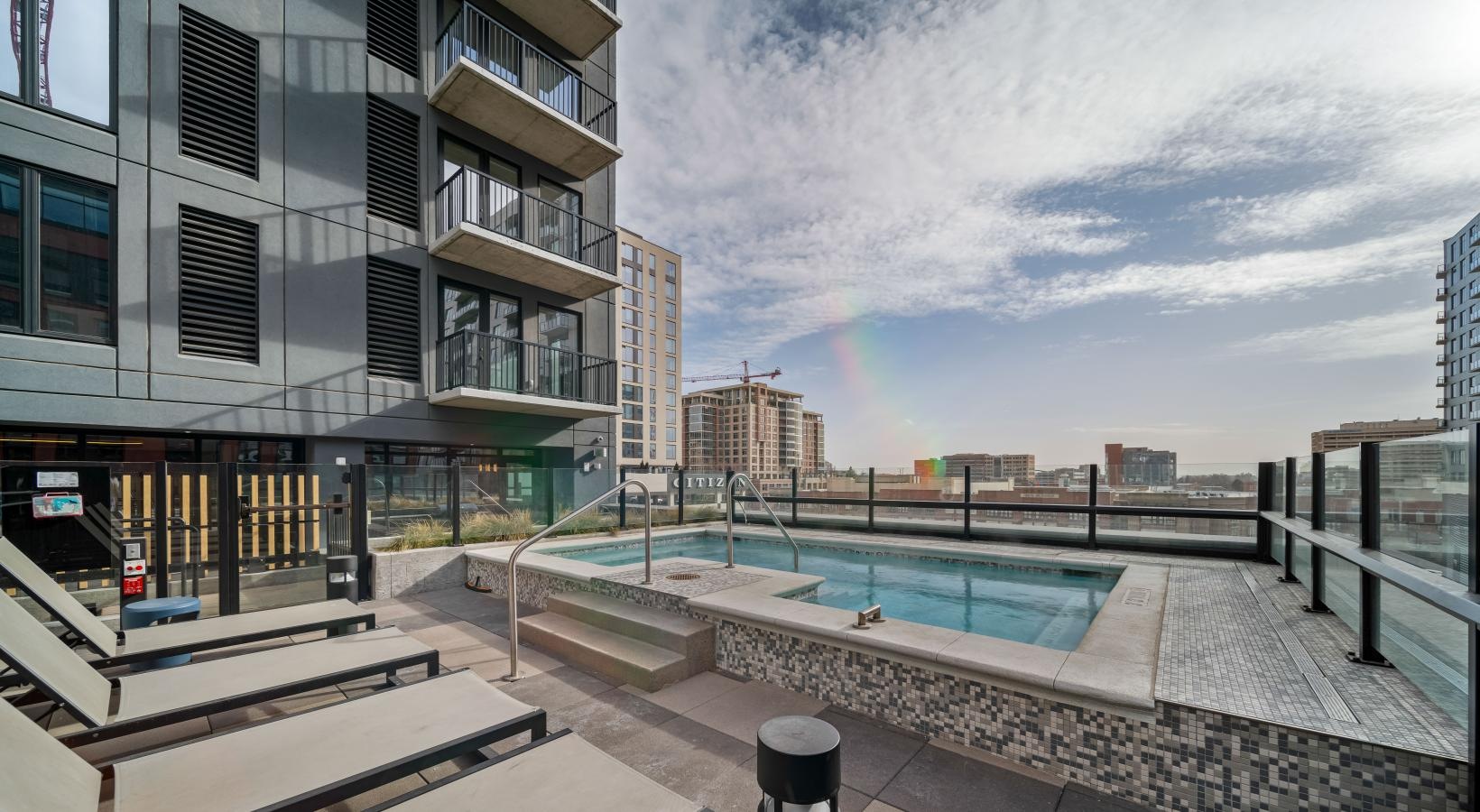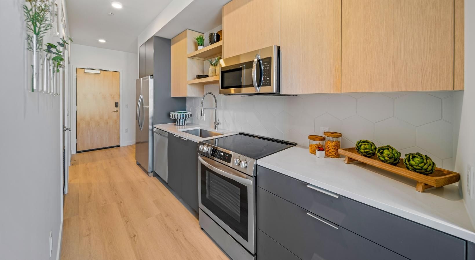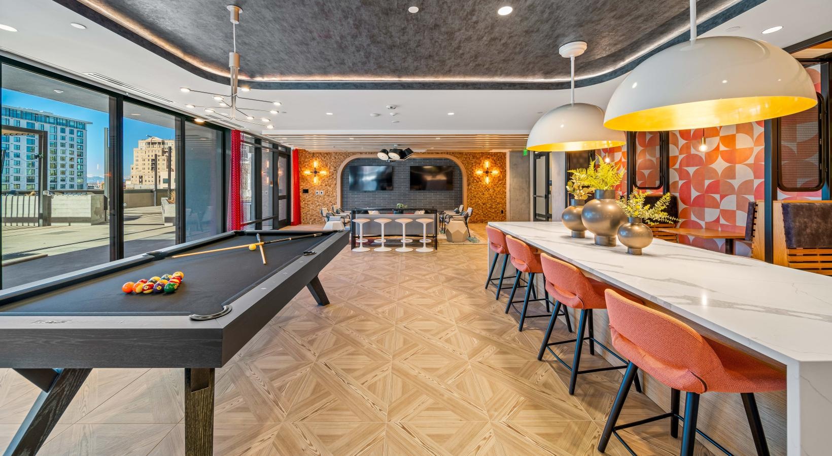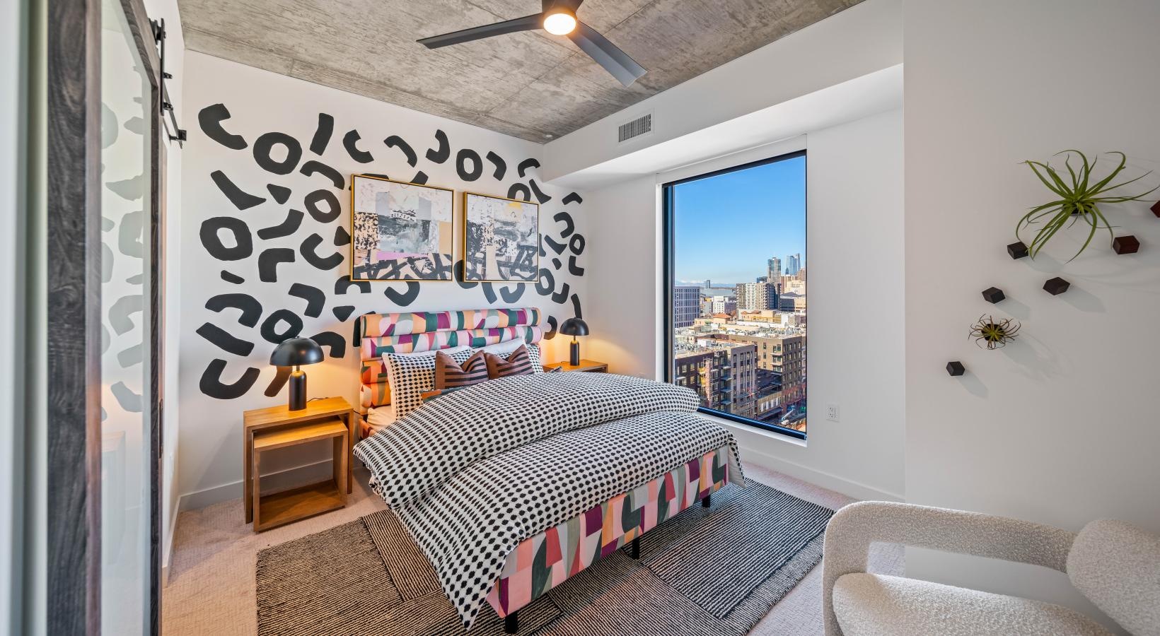 Life at Kindred is candid — neighbors chatting on the rooftop, morning coffee in the kitchen, a sunset glow across downtown.