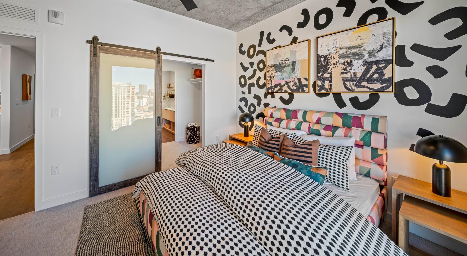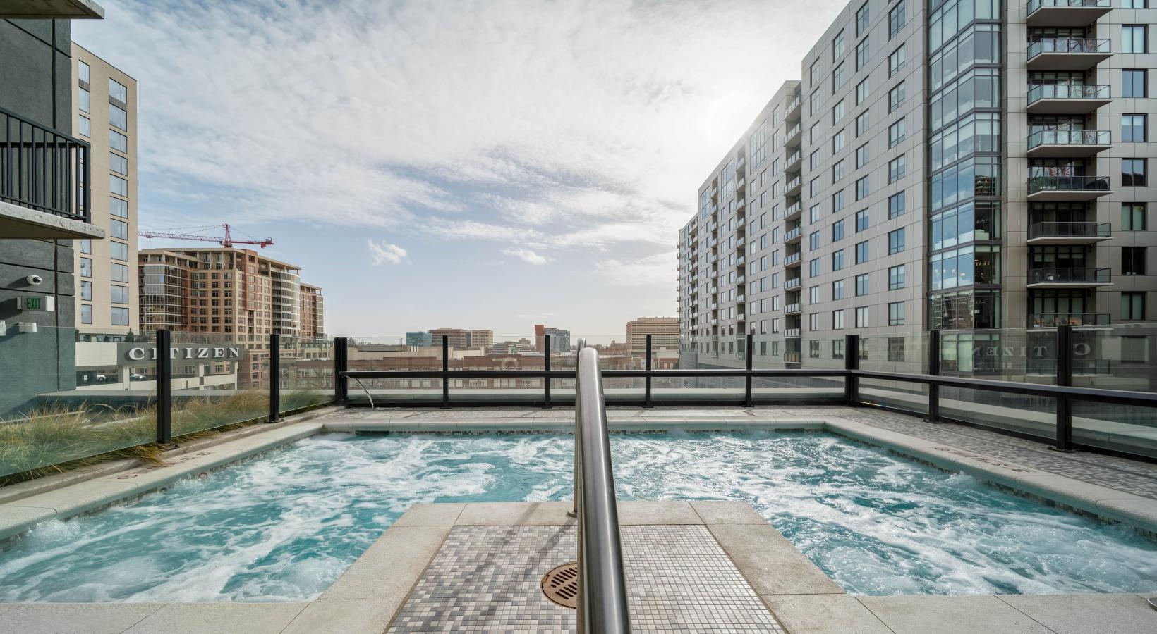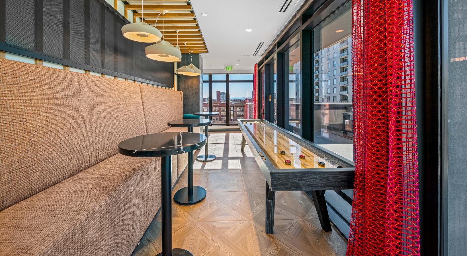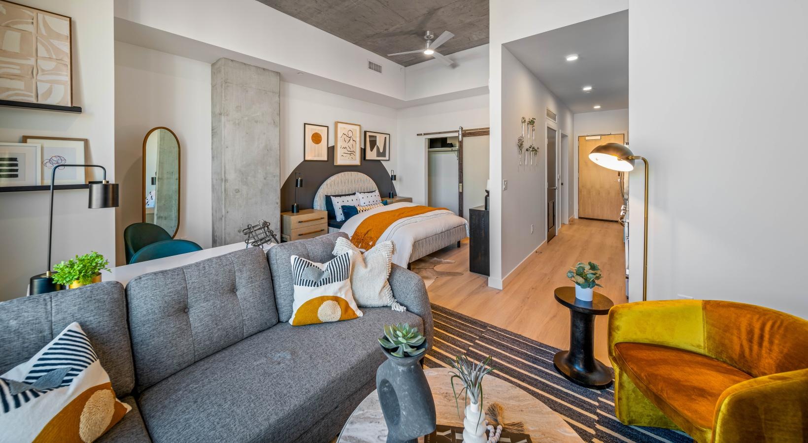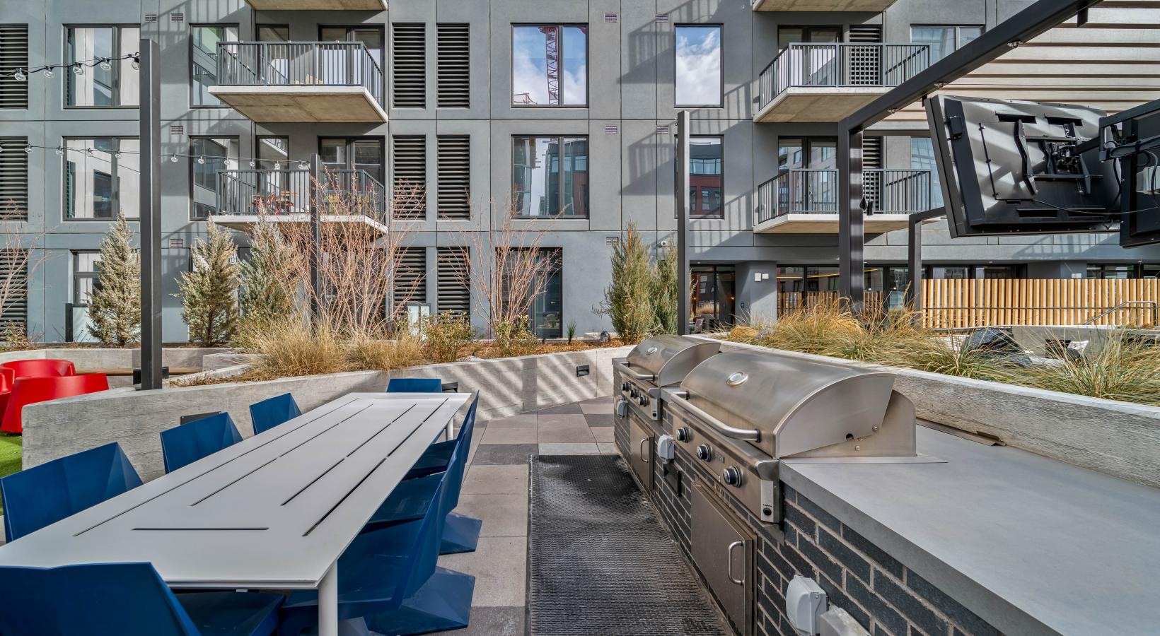 Life at Kindred is candid — neighbors chatting on the rooftop, morning coffee in the kitchen, a sunset glow across downtown.