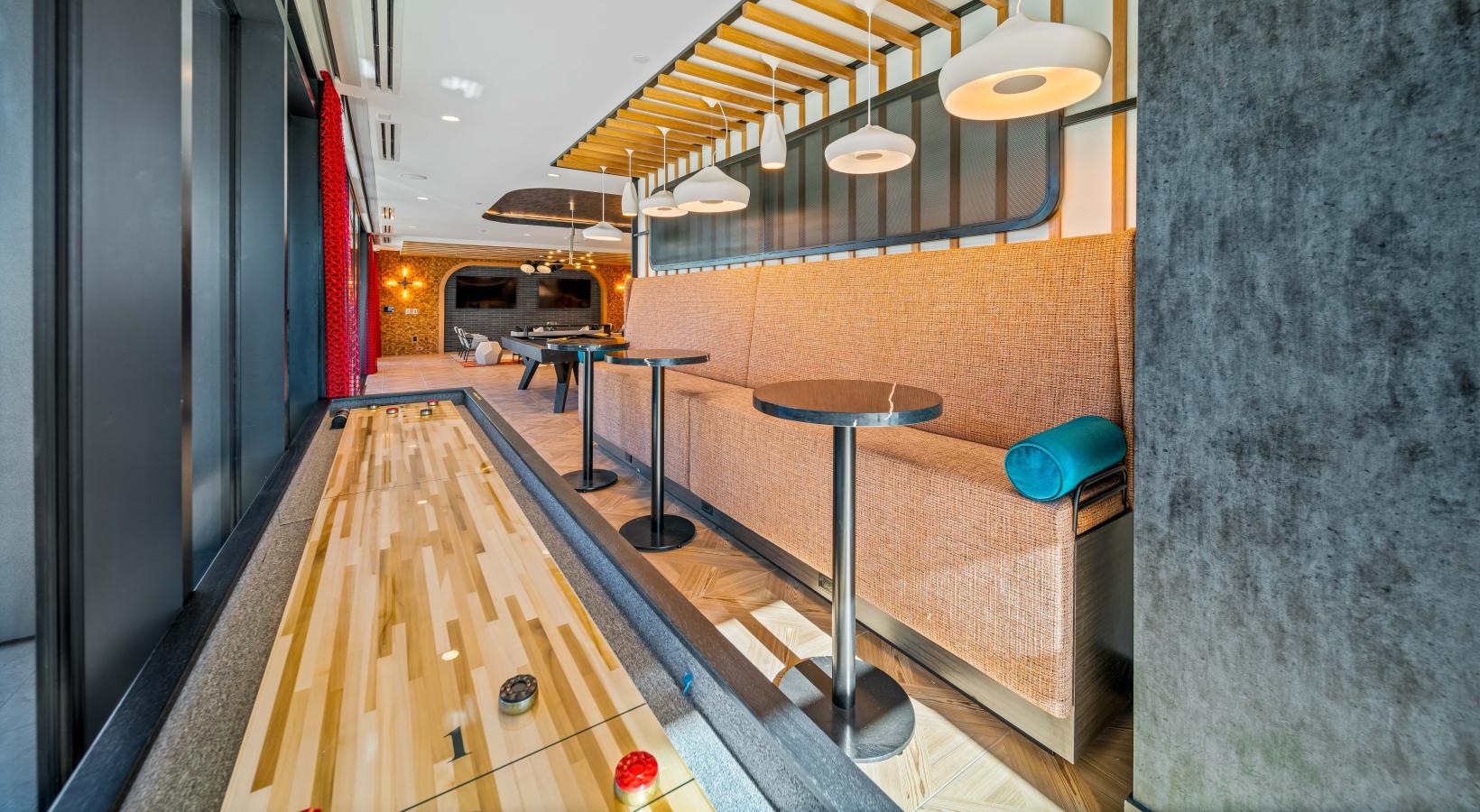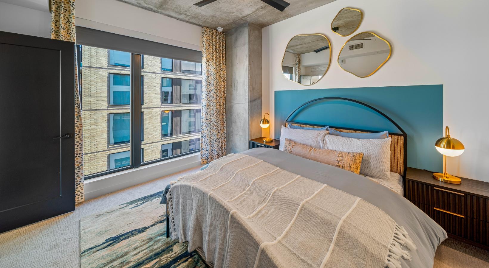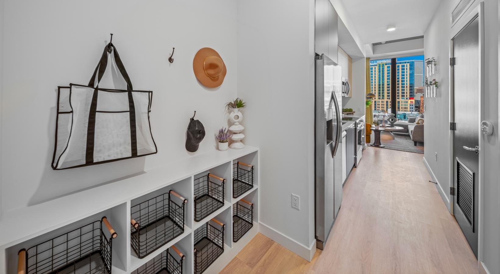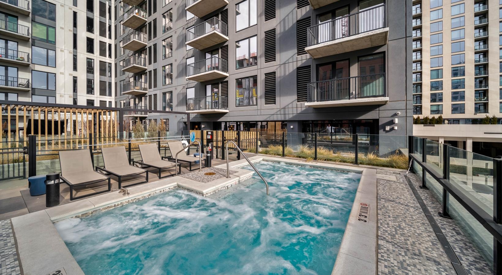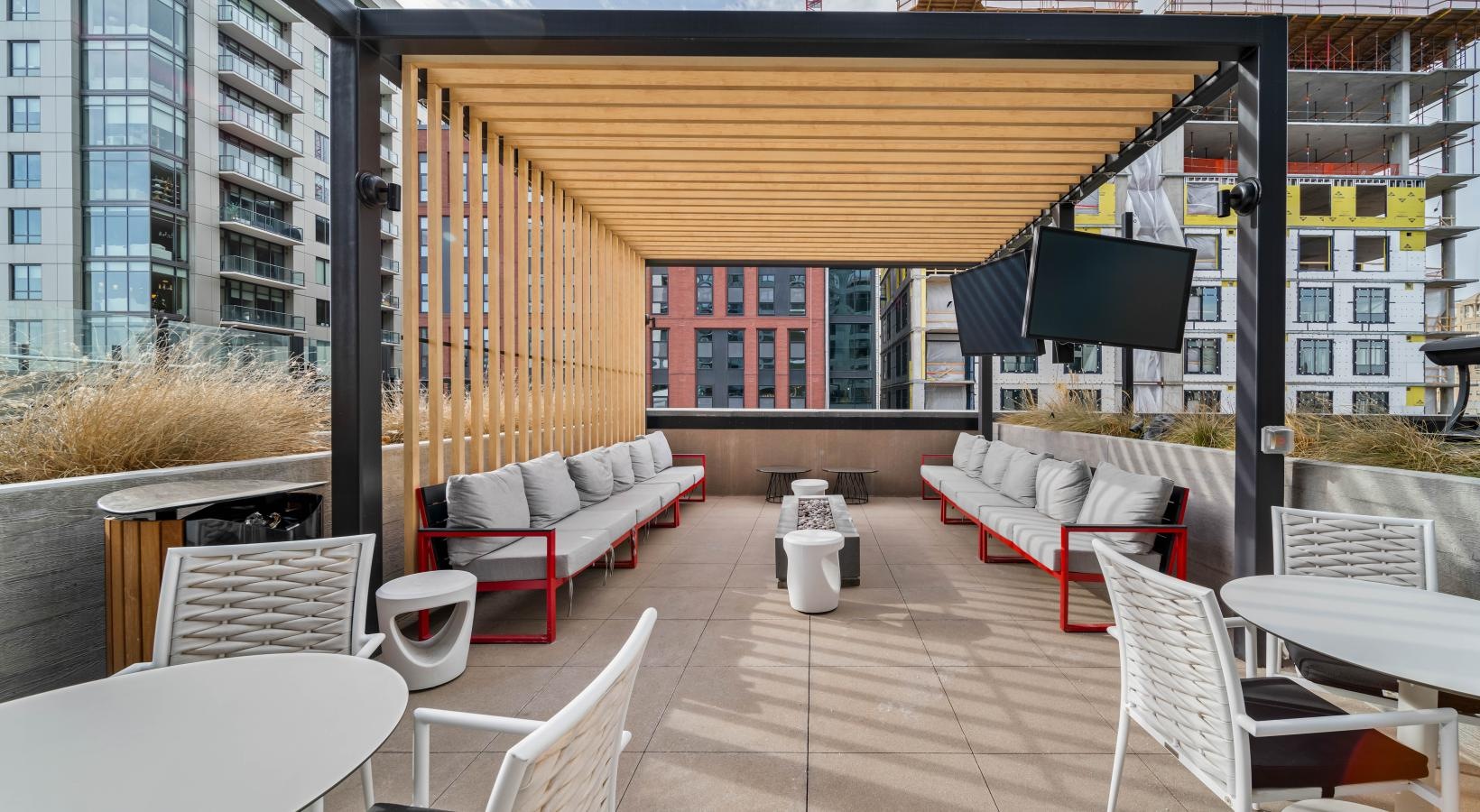 Life at Kindred is candid — neighbors chatting on the rooftop, morning coffee in the kitchen, a sunset glow across downtown.